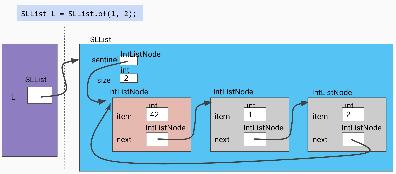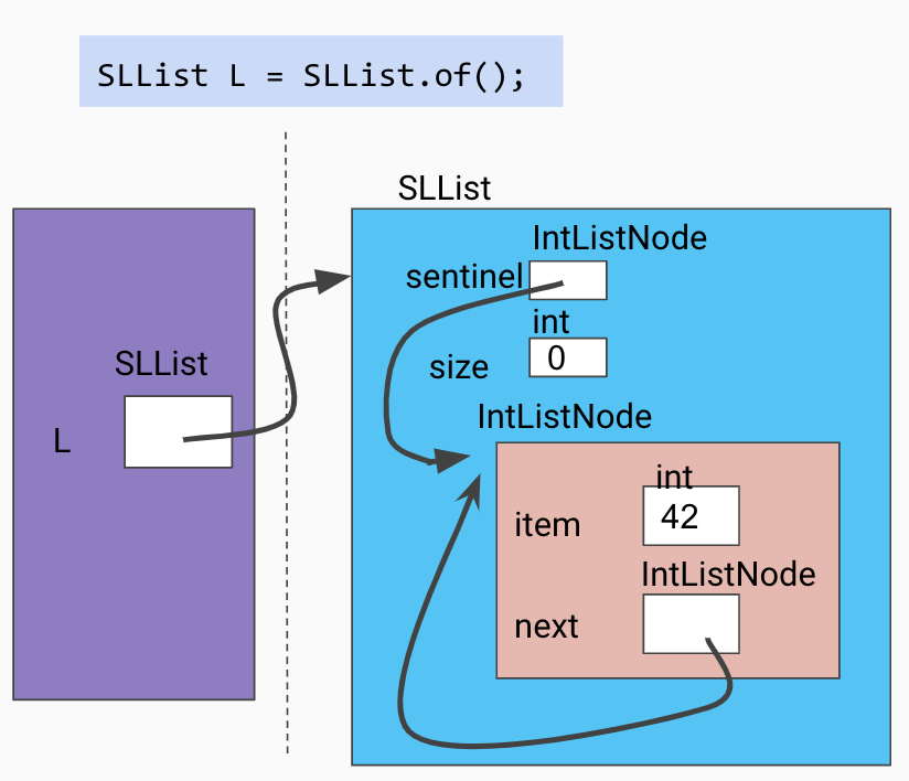 Note that throughout the lab, some of the images do not depict the size variable for simplicity. This variable is an instance variable for all SLLists even if it is not shown in our illustrations.