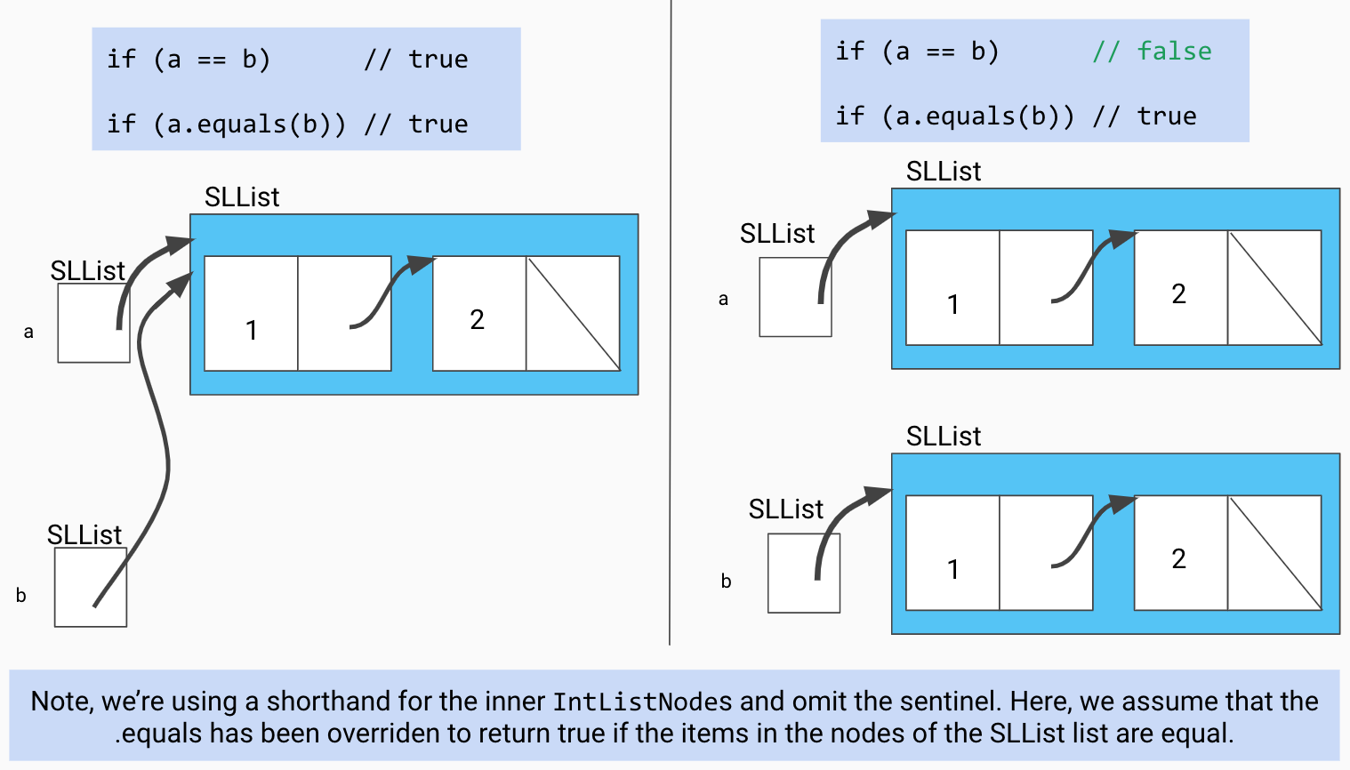 an equals method that checks whether or not list A and list B contain the same content, rather than checking if A and B refer to the same object. Here is an illustration of this difference: