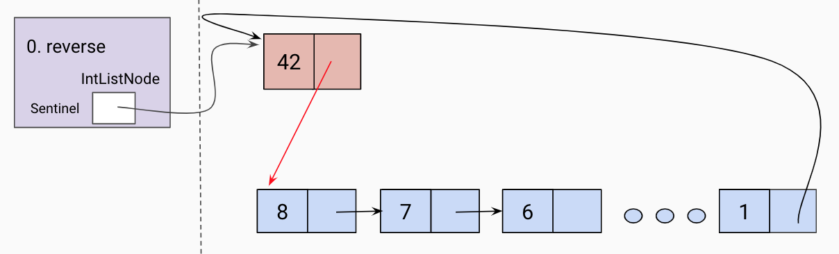 However, we can eliminate null checks and simplify our code greatly with usage of a sentinel node instead of the head pointer. The sentinel node always exists (even when our list is empty), and does not represent an actual node in the list. Its next field represents the front of the list, unless the list is empty. The sentinel’s item is some meaningless value (in this example, we have chosen 42, but it doesn’t matter what its value is; a sentinel’s item should never be accessed). The last node in the list should have its next pointing back at the sentinel, and an empty list is represented by just a sentinel node whose next points back to itself. In a box-and-pointer diagram, a empty singly-linked list with a sentinel looks like this: