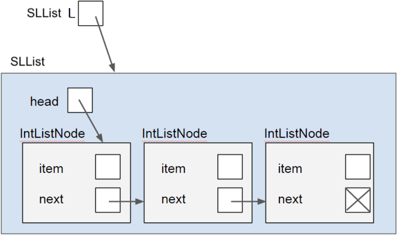All operations on the list are handled through an instance of an SLList object, which keeps a single instance variable head in order to track the first node in the linked list. The SLList object operates directly on the IntListNodes that make up the SLList. Note that IntListNode does not need any methods (other than some utility methods such as toString() and equals(), which you will use later). The main effect of using encapsulation, by using a reference to the head of a list, is hiding the internal representation and operations of the list from users. Instead, the users could simply operate on list as a whole and the SLList representation will take care of the operations, including any null checks, size checks, or further operations.